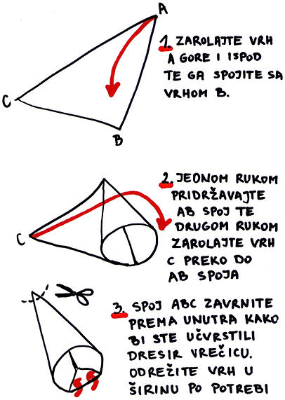 Za crtanje ili pisanje najbolje je na dresir vrečici odrezati samo malo vrh kako bi dobili čim tanji mlaz za pisanje.